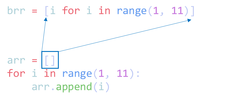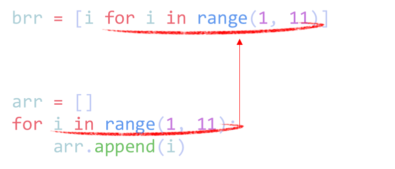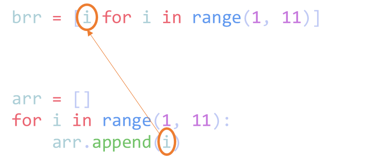 리스트 arr와 brr가 동일한 값을 갖게 된다. 리스트 컴프리헨션이 어떻게 작동하는지 간단하게 보면 다음과 같다.
